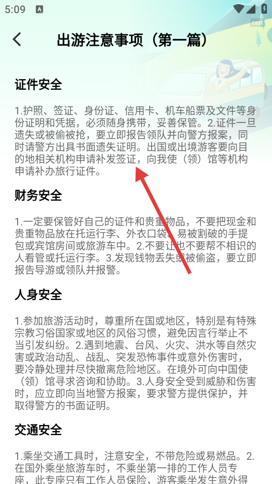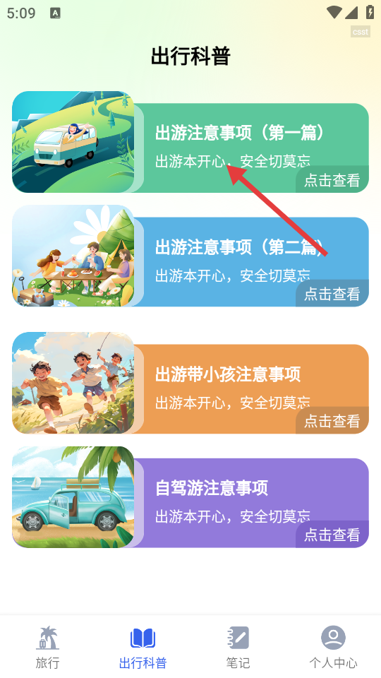 3、在出行科普页面里,选择【出游注意事项(第一篇)】,点击进入详情页。