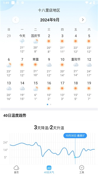 6.查看未来40天天气: 在主界面上,找到并点击“40日天气”选项,即可查看未来40天的天气预报情况。