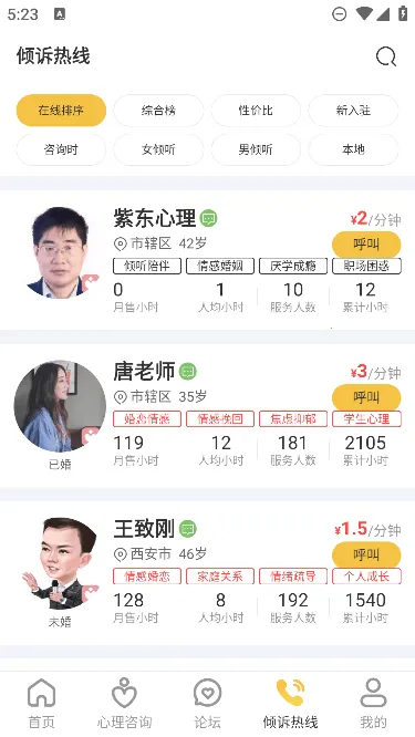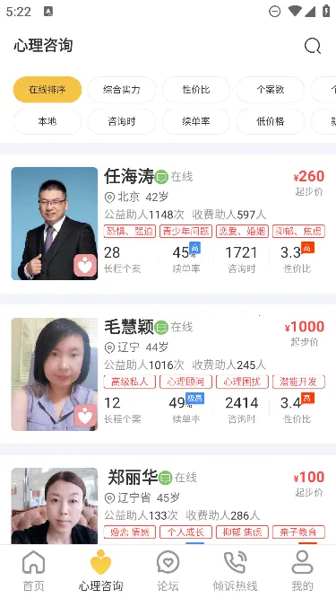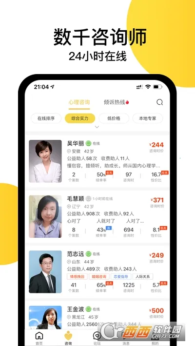1、汇聚专业人士:平台云集全国优秀心理咨询师、心理医生、婚姻家庭咨询师及情感专家,提供在线心理咨询服务。