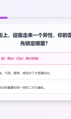 这是一款专为男生设计的独特评估工具。它基于支配顺从、视觉情感、纯爱混沌、幻想现实四个维度,通过20道题就能快速测出真实的XP类型。如今MBTI已不再新颖,而这款XPTI人格测试带来了全新体验。在短短20题的问答中,能让你清晰了解自身在不同维度的倾向。不同维度展现出各异的特质,无论是对支配顺从的偏好,还是在视觉情感等方面的侧重,都能在测试结果中呈现。这将帮助你更深入认识自己,探索内心潜藏的XP倾向,为自我认知打开新的视角。