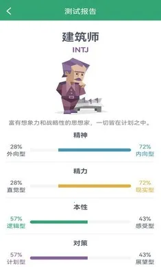 这款应用在人格测试方面表现出色。它提供了丰富的测试题选择,包括28题体验版、48题通用版以及93题完整版。用户能在短时间内完成测试,快速知晓自己的MBTI类型,进而判断适合的职业类型。测试题的设置较为全面,能较为准确地反映个人性格特点。整个测试过程流畅便捷,无论是界面设计还是操作体验都很不错。对于想要了解自身性格及职业适配性的人来说,是个值得尝试的工具,能帮助他们更好地规划未来方向,在职业探索道路上迈出重要一步。